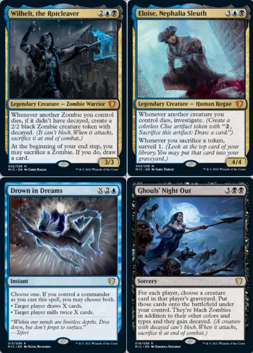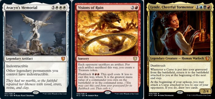 Per la prima volta in un prodotto del genere, vengono inserite otto carte destinate al Commander non presenti nei deck proposti. Queste quattro carte sono reperibili nelle buste da collezione di Innistrad: Caccia di Mezzanotte. Le carte in questione sono: Avacyn’s Memorial (artefatto pazzesco che protegge il comandante e le altre leggendarie del proprio deck, tornerà utile in competitivo), Curse of Obsession (la maledizione rossa che conclude il ciclo, potrebbe tornare molto utile in un Reanimator di Commander), Visions of Glory (spedinatore molto valido), Visions of Duplicity (per scambiare permanenti), Visions of Dread (buon reanimator da Commander), Visions of Ruin (molto interessante per spaccare artefatti e per generare vantaggio di tesori, tornerà molto utile nei formati eterni), Visions of Dominance (ottimo raddoppiatore di segnalini) e Lynde, Cheerful Tormentor (leggendaria dei colori Grixis che interagisce con le maledizioni, potrebbe creare un archetipo in Commander… Peccato che non è stato realizzato un deck intorno questa casa).