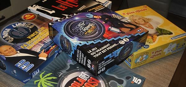 – I tanto criticati e snobbati giochi televisivi, catalogati a priori come spazzatura dai giocatori appassionati! Certo, avrebbero ragione se fossero tutti dei mix di Monopoly, Gioco dell’oca e Trivial pursuit, che è la cosa più facile da fare e che viene in mente a chi non conosce i giochi da tavolo moderni. In questa foto vedo 3 mie creature, in cui ho inserito meccaniche che si possono trovare anche in Ticket to ride, Splendor, Heimlich & Co, Lupus in tabula e Viva il re. Sicuramente quei giochi sono fatti meglio, però volevo solo dire che non tutti i giochi televisivi, e commerciali in generale, sono banali, noiosi, inutilmente lunghi e affidati al 99% alla fortuna. So che tu sei appassionato di giochi televisivi (quelle scatole sono tue, confessalo!) e spero che potrai confermarlo.