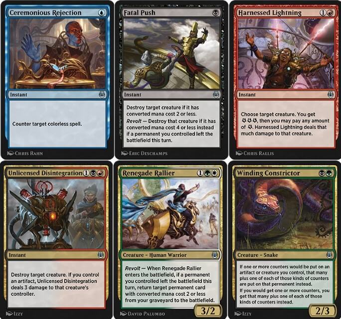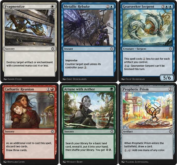 - Passiamo alle non comuni dell’espansione. Vediamo: Soccorritore Aereo (buona creatura evasiva per i White Weenie), Guardiano della Fiera (buona creatura da esilio, troverà spazio anche nell’Historic), Specialista in Riparazioni (potrebbe tornare utile nei combo per riciclare incantesimi ed artefatti), Campione del Cambio, Fanatica del Circuito, Manovratore Veterano (carte molto valide per l’archetipo Vehicle), Gru Nidolucente (buona creatura voltante per acquisire artefatti), Maga dei Trofei (buon tutore per artefatti che tornerà utile nell’Historic), Eteride Talentuoso (carta già testata in Historic, torna utile nei Black Devotion), Apprendista dell’Inventore (può tornare utile negli archetipi Aggro Artifact ed Equipment), Intruso Famelico (ristampa funzionale dell’Atog, va in combo con Scagliare ma solo se ha mangiato molti artefatti), Servitore del Flusso (buon motore di mana per gli Energy), Cucciolo di Zannalunga (creatura molto apprezzata per gli archetipi Aggro Energy, tornerà utile nell’archetipo dell’Historic), Rinnegato di Narnam (tornerà utile nell’Elf Tribal dell’Historic), Rivoluzionaria di Pugnomartello (ha Prolifera ma è obbligatorio, nell’archetipo può tornare utile), Attivista Rinnegato (reanimator per creaturine, è giocato negli Zoo e nei Toolbox per ricomporre l’esercito), Raffinatore Fuorilegge (buon cantrip per gli archetipi Energy), Lottatore Voltaico (altra valida carta dell’Aggro Energy), Costrittore Sinuoso (ottima creatura molto giocata negli Abzan e Golgari Aggro, tornerà molto utile anche in Historic), Ornitottero (cult evasivo che troverà spazio anche in Historic), Capo della Fonderia, Ispettore della Fonderia (entrambe tornano utili negli archetipi Artifact), Esibizione di Servomeccanismi (nuovo spedinatore che tornerà utile nei Lukka Combo di Historic), Arresto dei Totteri (l’Anello dell’Oblio dell’edizione, tornerà utile nei Control e nei Midrange dell’Historic), Restaurare (reanimator da giocare nei Control), Rifiuto Cerimonioso (ottimo counter da side, tornerà utile contro gli Artifact dell’Historic), Barlume di Genialità (peschino per i Control Energy), Spinta Fatale (uno dei migliori removal in circolazione, tornerà decisamente utile anche in Historic), Fulmine Imbrigliato (ottimo removal per gli archetipi Energy), Legge di Natura (buon removal per i deck Aggro e Stompy), Difesa Sbocciata (pump e protezione che tornerà molto utile negli Aggro e Midrange), Condizioni Pericolose (un mass-removal per gli archetipo Counter), Riserva Nascosta (buon spedinatore per i Critters), Disintegrazione Abusiva (buon removal che tornerà molto utile negli archetipo Rakdos Sacrifice) e Centro dell’Etere (terra per gli archetipi Energy);
