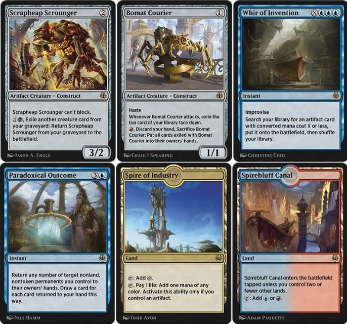 - Partiamo con le rare dell’espansioni. In primis vediamo che in Historic entrano legali le cinque Fast Lands dai colori nemici, un ottimo colpo per chi gioca in gioca in competitivo. Per le creature rare, abbiamo: Forgiattrezzi Esemplare (buona creatura aggressiva per gli UW Ensoul di Pioneer, l’archetipo si può replicare anche in Historic), Sram, Edificatore Capo (buon peschino per gli Auras, gli Equipment e i Vehicle), Baral, Commissario della Conformità (eccezionale per gli Storm di Modern, troverà spazio anche in Historic), Padeem, Console dell’Innovazione (è giocato nel MUD e nei deck con molti artefatti, troverà spazio anche negli archetipi con molti artefatti dell’Historic), Convogliatrice Bracciolucente (molto giocata negli Human e Dimir Midrange di Pioneer, potrebbe trovare spazio anche in Historic), Gonti, Signore del Lusso (questa carta la conosciamo in Historic grazie a Jumpstar, torna sempre utili nelle side dei deck neri), Yahenni, Partigiano Immortale (si gioca molto in Commander, ma negli Aristocrats degli Historic potrebbe trovare spazio), Ribelle Tempralesto (è abbastanza giocato nei Dragon Stompy in monocopia, anche qui potrebbe nascere un archetipo simile), Kari Zev, Predona di Avionavi (rara molto semplice, ma sempre utile dei Red Deck Wins, tornerà ad esser giocata anche in Historic), Pia Nalaar (creatura leggendaria molto versatile su più formati, anche l’Historic lo giocherà nei vari Midrange), Idra Irsuta (creatura aggressiva per gli Aggro Energy, è il bestione dell’archetipo), Furioso della Cintura Verde (stesso discorso per questo elefante, molto potente negli Stompy Energy), Rishkar, Rinnegato di Peema (nell’Historic è conosciuto grazia a Jumsptar, nei Mono Green Counter viene abbastanza giocato), Oviya Pashiri, Saggia Forgiavita (anche in monocopia negli Artifact Combo può tornare utile), Depala, Pilota Esemplare (essenziale nell’archetipo Mardu Vehicle, archetipo che prenderà piede anche nel formato), Kambal, Console dell’Assegnazione (eccezionale nelle side di Vintage, troverà spazio in molti deck competitivi dell’Historic), Assaltatore Elettrostatico (potrebbe portare l’archetipo Plummer in Historic, da tenere d’occhio), Collettore di Rottami (altra ottima carta da combo, con nei MUD, tornerà utile anche in questo formato online), Colosso di Metallo Lavorato (tornerà utile nei deck Artifact dell’Historic, si gioca facile con tutti quei motori di mana), Carovana della Coltivatrice, Mietitore dell’Etersfera (entrambe vengono giocate in Pioneer nelle side dei Mono Black Control, potrebbe tornare spazio anche nell’Historic), Mimic Metallico (eccezionale carta per i Tribal, troverà molto spazio nel formato), Sciacallo dei Rottami (altra ottima carta per i Reanimator e per i Mono Black Aggro, ottimo guadagni per il formato), Corriere di Bomat (altra eccezionale carta per i Red Deck Wins e gli Aggro, il formato guadagna una carta eccezionale) e Speranza di Ghirapur (ottima carta versatile in più archetipi, tornerà molto utile nel formato). Tra le restanti carte vediamo: il “Ciclo delle Competenze” (cinque magie con costo di mana alternativo, sono molto versatili torneranno utili in Historic), Fumigare (il formato Historic guadagna un nuovo mass removal, tornerà molto utile nei Control di ogni sorta), Autorità dei Consoli (buona carta da side anti-Aggro, torna molto utile nei vari Life), Azione di Confisca (buona carta da furto per gli archetipi Energy), Veto (ottimo counter, i Control dell’Historic guadagnano una carta molto versatile), Ronzio dell’Invenzione (una delle carte più potenti dell’espansione, che è molto giocata nell’omonimo archetipo e nell’Urza. Troverà spazio anche in Historic, creerà nuovi archetipi nel formato), Esito Paradossale (altra carta fenomenale molto giocata in Legacy e Vintage nell’omonimo archetipo, anche nell’Historic potrebbe nascere un archetipo alternativo), Eredità Perduta (carta da side, tornerà molto utile per smontare i Combo), Intervento Eroico (essendo ristampata in Set Base 2021, questa carta viene giocata nelle side degli Aggro e Stompy dell’Historic), Sogni Più Sfrenati (potrebbe tornare utile in Combo e Storm e simili), Giuramento di Ajani (ottima carta per gli archetipi Superfriends), Oscuri Segnali (buona carta per i Grixis Control dell’Historic, tornerà utile per rigiocare più volte Nicol Bolas, Drago Divino), Modulo di Animazione (buona carta per l’archetipo Counter, tornerà utile nel deck Historic), Serbatoio di Eterflusso (ottimo artefatto da combo da sfruttare in molti archetipi, in Historic si potrebbe giocare nell’Heliod Life), Chiavi della Città (potrebbe tornare utile nell’archetipo Ensoul Artifact), Torre Dinavolt (artefatto che genera un omonimo archetipo Energy, si potrà formare anche nell’Historic), Panarmonico (si gioca nel Copycat, nell’Historic fa combo con Saheeli Raji), Bestiario del Forgiavita (artefatto per pescare nei Mono Green, torna utile anche negli Elf Trbal), Fiera degli Inventori e Spirale dell’Industria (ottime terre per i deck Artifact, torneranno molto utili nel formato online);