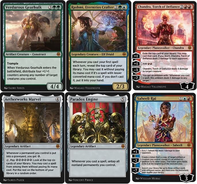 - Concludiamo con le rare mitiche, vediamo: “Il Ciclo dei Meccatitani” (le cinque creature artefatto colorate, dagli effetti devastanti, diventano legali in Historic. Torneranno molto utili in più deck competitivi, qui sono presenti con doppia illustrazione), Angelo dell’Invenzione (buon pump e spedinatore, da giocare in combo con Dono del Dio Faraone e Thassa, Abitante degli Abissi), Evocazioni Metallurgiche (visto il successo di Tifone di Squali, anche questa carta troverà molto spazio nei Ramp e nei Control di sorta dell’Historic), Demone dalle Trame Oscure (può tornare negli archetipo Energy per controllare e rimuovere le piccole creature), Araldo dell’Angoscia (una finale dell’archetipo Improvise), Creatività Indomita (nei Ramp si può sfruttare, anche se le tre mana sono pesanti), Chandra, Fiamma di Sfida (la miglior versione di Chandra, è un ottimo acquisto per l’Historic, verrà giocata in molti Midrange), Nissa, Forza Vitale (non la migliore Nissa, ma comunque tornerà utile nei vari Ramp), Ajani l’Inflessibile (questa versione di Ajani è da supporto per gli Stompy e i Superfriends), Tezzeret il Manipolatore (non la migliore versione di Tezzeret, ma torna utile negli Artifact), Dovin Baan (tornerà utile negli Azorius Control del formato), Saheeli Raji (purtroppo non è presente Guardiano Felidar, ma potrà tornare utile anche nell’Historic in archetipi simili), Rashmi, Plasmatrice di Eternità (viene giocata negli omonimi Midrange per giocare più magie possibili, è un ottimo acquisto per l’Historic), Acciaio da Scolpire (l’unica carte delle Invenzioni di Kaladesh presente nell’espansione online, si può reperire tramite buy-a-box o crafting. Secondo gli autori, tornerà molto utile negli archetipi Combo o Control), Cuore di Kiran (i Mono Green di Pioneer la giocano in sideboard, sono dell’idea che troverà spazio anche in molti Aggro), Sovrana Celeste, Ammiraglia dei Consoli (anch’essa è molto giocata nelle varie side, specialmente se presa con Karn, il Grande Creatore), Macchina del Paradosso (artefatto molto potente negli archetipi Artifact, tornerà utile anche nell’Historic… Ottimo guadagno), Ponte Planare (viene giocato nel MUD e nel Golos da Legacy, forse in Historic troverà spazio negli Artifact Combo) e Prodigio dell’Eterurgia (la carta chiave del Through the Marvelous, troverà spazio anche nell’Historic).