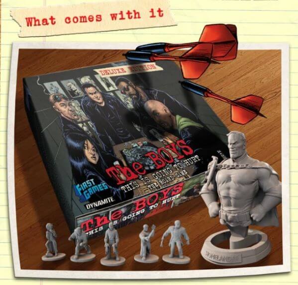Sei ancora qua, allora ti dico che il progetto grafico di questo gioco è curato direttamente da Darick Robertson il disegnatore del fumetto (scritto dal maestro Garth Ennis) e che lo scopo del gioco è quello di sconfiggere The Homelander (Patriota nella versione italiana) impersonando uno dei protagonisti del fumetto in un gioco competitivo per 2-5 giocatori. Aggiungo che la versione deluxe (100 $) aggiunge le miniature dei personaggi e un busto di 140mm di Homelander.