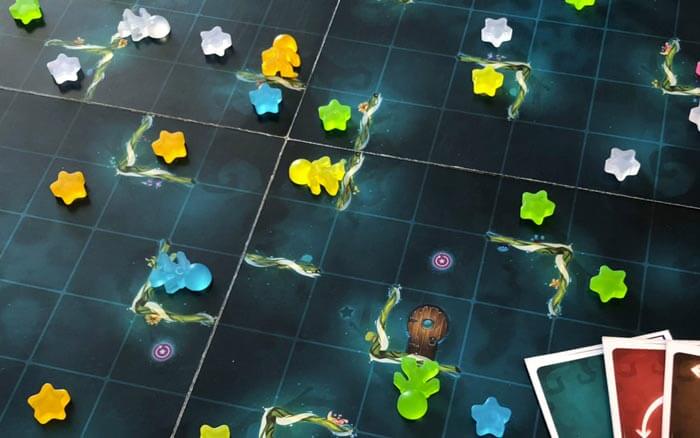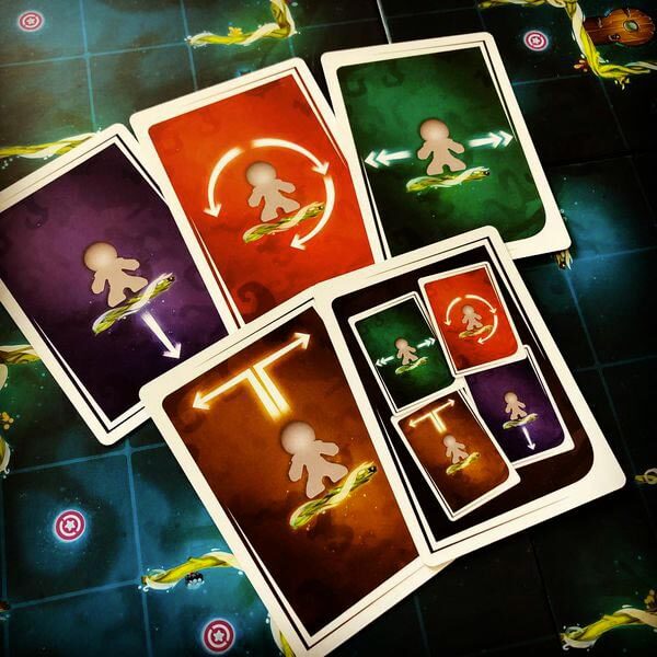 4 carte hanno una azione ben specifica, mentre la quinta è una carta jolly che permette di eseguire una delle altre 4 azioni. In alternativa, sul retro della carta è sempre presente l’azione dello spostamento laterale di una casella. Tutte le azioni devono essere eseguite nella loro interezza, e solo successivamente si applica l’effetto della gravità.