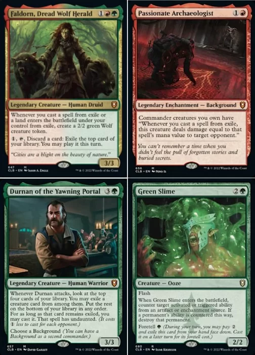 Exit from Exile è un deck Gruul (accoppiata verde e rossa) Aggro, che sfrutta le meccaniche Exile. Le magie si potenziano sfruttando tutte le magie d’interazione con la zona d’esilio, pensiamo a: Sospendere, Predire, Avventura e Cascata. Il simbolo del deck è il comandante proposto Faldorn, Dread Wolf Herald, ma sono presenti anche le seguenti carte: Passionate Archaeologist (background molto utile nell’archetipo Exile), Illuminare la Scena (un classico per pescare), Anziano della Tribù-Sakura (una delle migliori creature ramp comuni di sempre), Elfa dalle Trecce Rosse (una delle carte più giocate del Modern, il cardine dei Jund e i Naya), Gigante Sbriciolaossa // Schiacciare (ottima creatura Burn, torna molto utile nell’archetipo Exile), Regina dei Calabroni (uno dei migliori spedinatori di sempre), Green Slime (ottima creatura counter, può tornare molto utile anche fuori il Commander), Nalfeshnee (copia i permanenti e le magie esiliate), Stregone della Magia Selvaggia (molto utile per giocare magie aggiuntive), Fuga nelle Terre Selvagge (ottimo nel deck per acquisire carte), Tlincalli Hunter // Retrieve Prey (ottimo per il deck per giocare gratis creature dall’esilio), Urabrask il Nascosto (ottimo in Commander per infliggere danni e fare attacchi rapidi), Venture Forth (ottima per acquisire terre in Commander), Vivien, Campionessa delle Terre Selvagge, Xenagos, il Dissoluto (entrambi ottimi nel deck, che interagiscono bene con le meccaniche d’esilio), Mammut da Battaglia (ottimo mastodonte per pescare) e Durnan of the Yawning Portal (ottimo per lanciare le magie esiliate). È una tematica decisamente innovativa, stranamente accoppiata a due colori non canonici per la meccanica. Potete migliorarlo con tante carte utili, allo stesso tempo si possono aggiungere altri colori come il bianco o il blu. Provatelo se volete sperimentare qualcosa di nuovo.