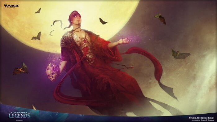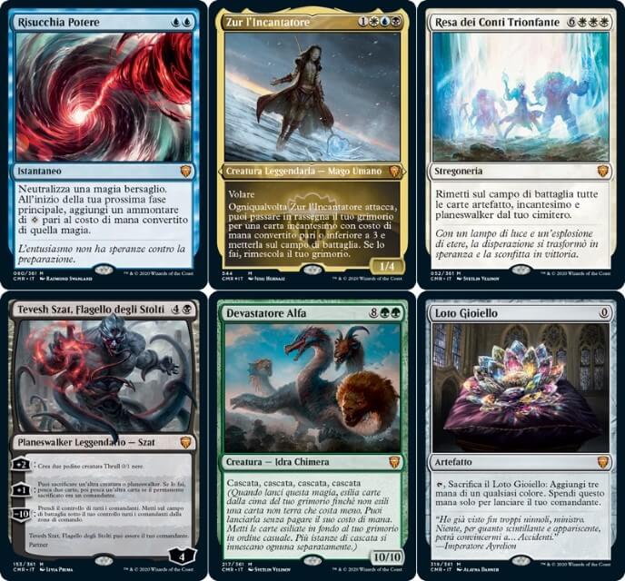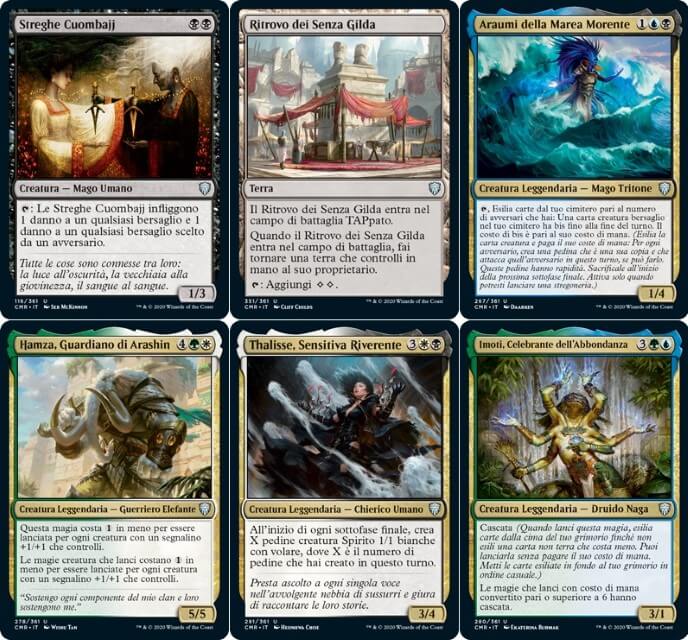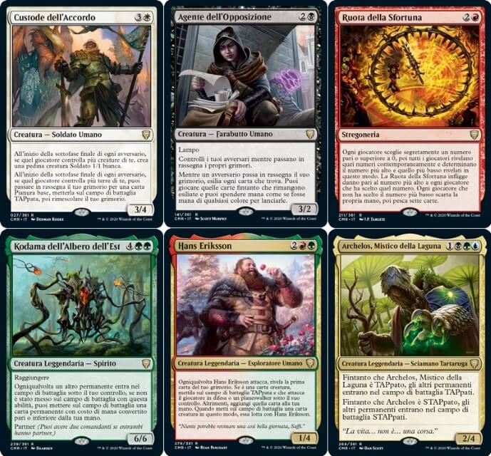 - Continuando con le rare, tra ristampe vi segnalo: Magistrato Immacolato, Ordine Severo, Atto Blasfemo, Bastone della Dominazione, Anelli dell’Allegro Focolare, Disco di Nevinyrral e Faro di Comando. Per le rare inedite, vediamo: il “Ciclo delle Volontà” (cinque magie che si potenziano se si controlla un comandante. Sono molto utili nel Commander), il “Ciclo della Corte” (cinque incantesimi che ti rendono il monarca, torneranno molto utili in Commander), Promessa del Domani (da giocare in combinazione con un mass removal. Potrebbe tornare utile anche in Legacy), Annientare i Ranghi (ottimo mass removal per Commander), Custode dell’Accordo (buona creatura per equilibrare il gioco, oltre il Commander, potrebbe trovare spazio nei Control di Legacy), Solcacielo Corazzata (ottimo negli Equipment di Commander), Anima dell’Eternità (un Avatar di Serra migliorato, che con Bis possiamo copiare… Decisamente ottimo nei Life di Commander), Livio, Sentinella Giurata (nelle partite multiplayer e nei Two-Headed Giant torna utile per blinkare le creature), Sbagliare Strada (utile in multiplayer per generare caos e depotenziare il giocatore più forte), Amphin Ammutinato (pur facendo un regalo, torna utile per esiliare le creature più potenti degli avversari), Sfondascafo (in Commander permette di generare molte pedine tesoro, potrebbe trovare in spazio anche in Legacy), Corpo della Conoscenza (sublime in Commander per pescare di massa), Servo del Laboratorio (ottimo per pescare in tutti i deck che sfruttano il cimitero), Apprendista di Sakashima (un Clone versatile con Lampo, tornerà molto utile in Commander), Eligeth, Augure dei Crocevia (pazzesca per pescare con l’abilità profetizza, tornerà decisamente utile in Commander), Ruota della Sfortuna (per pescare in Commander, ma infligge anche danni. Negli archetipi Wheel tornerà decisamente utile), Capitano di Emberwilde (ottimo per diventare monarca negli archetipi Izzet Control, specialmente per infliggere danni di massa), Messaggera Ignifera (carta che diventerà obbligatoria in tutti i deck di Commander che sfruttano il rosso, Cascata è sempre utile), Reclutattrice Coercitiva (una creatura da furti nei Pirate Tribal), Fenice dell’Aurora (buona creatura nei Cascade Temur, assolutamente da giocare nell’archetipo), Krak, Senza Pollici (per copiare le magie, nonostante abbia la casualità della moneta), Maledizione Necrotica (mass removal per il Commander), Signore del Terrore Elfico (creatura mass removal per gli Elf Tribal), Mietitrice di Belladonna (in Commander diventa abbastanza grande se giocata nei primi turni), Umilitatore Rakshasa (una bomba per reanimare in Commander, con Bis diventa pazzesca), Agente dell’Opposizione (una delle migliori carte di tutte l’espansione! Tornerà decisamente utile in tutti i formati eterni, in particolare in Vintage… Stupenda, smonta tutti i tutori in circolazione!), Sengir, il Barone Oscuro (Sengir ritorna in versione multiplayer, da giocare esclusivamente in Commander), Razziatore della Piaga (da regalare agli avversari, altrimenti dona solo malus), Ammasso di Bioscorie (da giocare negli Ooze Tribal, ma spedina bene in Commander), Reggente di Raduralba (ottimo bestione per diventare il monarca e proteggere i permanenti in Commander), Eremita della Dolceceresina (ragno decisamente versatile per potenziare creature e lanciare magie), Maga dell’Ordine (si conclude in “Mega-Ciclo dei Magus”, si rifà alla stregoneria Ordine Naturale. Tornerà molto utile in Commader), Kodama dell’Albero dell’Est (ottimo per lanciare permanenti dalla mana, in Commander fa davvero belle combo), Kwain, Ficcanaso Nomade (leggendaria molto semplice per pescare e guadagnare punti vita), Nymris, Ingannatore di Oona (utile per acquisire carte in Commander), Blim, Genio della Commedia (per regalare permanenti, potrebbe funzionare nei deck con i malus), Lathiel, l’Alba dell’Abbondanza (ottimo per distribuire segnalini negli archetipi Life), Hans Eriksson (davvero valido per aggiungere creature in gioco, il suo malus è un richiamo alla lore del personaggio), Liesa, Manto del Crepuscolo (buon comandante che permette di pagare in punti vita i costi aggiuntivi, in draft è decisamente interessante), Belbe, Osservatrice Corrotta (torna utile per abbondare di mana, ma può donare vantaggi agli avversari), Zara, Reclutatrice Rinnegata (molto buona in Commander per rubare temporaneamente creature), Bell Borca, Sergente Spettrale (leggendaria che sfrutta le meccaniche dell’esilio, potrebbe generare un nuovo archetipo), Gor Muldrak, Amphimologo (leggendaria che genera caos tra i giocatore, ma attenzione che può tramutarsi in un malus), Obedeka, Cronologista Brutale (leggendaria che permette di interrompere il turno, in Commander torna utile per alleanze momentanee), Yurlok della Batost Ustionante (leggendaria che ricrea l’Eccesso di Mana, in Commander torna decisamente utile), Avernay, il Germoglio del Caos (perfetta nell’archetipo Temur Cascade), Colfenor, L’Ultimo Tasso (può generare piccole combo negli archetipi Difensive), Ghen, Tessitore Arcano (riciclaggio nei deck Enchantress), Jared Carthalion, Vero Erede (leggendaria da lore, da giocare negli archetipi Monarch), Gnostro, Voce dei Dirupi (da giocare negli archetipi Storm e simili per sfruttare la sua multi-abilità), Nevinyrral, Tiranno di Urborg (creatura decisamente valida, specialmente se giocato solo aver fatto esplodere l’omonimo disco. Decisamente utile in Commander), Amareth, la Scintillante (ottima per aggiungere carte negli archetipi Bant di Commander, diventerà obbligatoria nel colore), Archelos, Mistico della Laguna (stupendo per ritardare gli avversari. Potrebbe generare nuovi archetipi Amulet, decisamente interessante), Sala della Guerra (utile per pescare nei deck Commander monocolore), Pietra dell’Orizzonte (un convertitore di mana colorato) e Prototipo di Gladiogrifone (un distruttore di permanenti rubati);