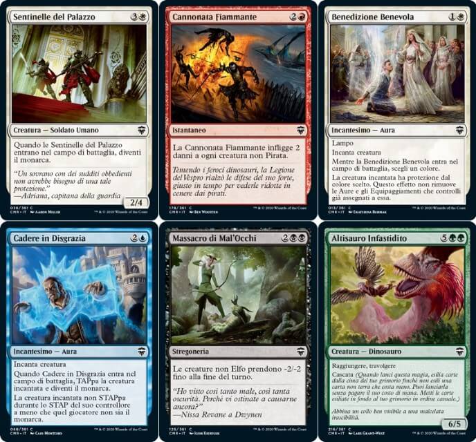 - Iniziando con le comuni, vediamo ristampe molto interessanti. Vi segnalo: Elfi di Fyndhorn, Elfa del Rifugio Lontano, Veggente di Visceri, Predestinare, Dipartita Agghiacciante, Sfera del Comandante, Torre di Comando, Palazzo di Opale, Astrolabio Sferico, Prisma Profetico, Sentinella del Palazzo, Spina della Rosa Nera, Entourage di Trest (le migliori carte da Pauper che ti rendono monarca), Predone Sacco di Carne, Famiglio di Filigrana, Ispettore della Fonderia, Campione della Fiamma, Flusso di Ricordi, Cannonata Fiammeggiante, Munizioni Improvvisate, Tomo di Jalum e Armeria di Iroas (declassati a comuni, torneranno tutte decisamente utili nel competitivo di Pauper… ottima entrata!). Tra le comuni inedite, vi segnalo: Il Pifferaio Prismatico (nulla di speciale, ma in draft tornerà utile per creare l’identità del proprio deck in caso di prese sfortunate), Messaggera di Kinsbaile (in multiplayer potenzia bene il nostro esercito o il comandante), Consacratrice del Valore (nelle partite in late game di Pauper diventa potenzialmente grande), Benedizione Benevola (la versione migliorata di Benedizione di Cho-Manno… Gli Auras ringraziano, ma verrà giocata in molti altri deck di Pauper. Bellissima!), Esploratesori (per pescare in multiplayer), Ricognitore del Velaliante (torna utile in draft per infliggere danni evasivi), Ammiraglia della Flotta Azzurra (una creatura blu che ti rende un monarca, si trasforma in una buona evasiva), Cadere in Disgrazia (ottimo pseudo-removal che ti rende monarca, verrà molto giocata in Pauper… Serviva una carta così al blu), Negazione Vigorosa (counter pesante per il Pauper, ma è ottimo in Commander per generare vantaggio), Profetessa Elfica (l’opposto di Elfa Visionaria, tornerà utile per l’archetipo Elf Tribal Golgari), Capocaccia Eccelso, Esperto della Rovolama, Sterminatori di Mal’Occhi (elfi da giocare nel draft), Massacro di Mal’Occhi (ottimo mass removal per l’archetipo Elf Tribal, è da giocare assolutamente in Pauper), Ladruncolo Impulsivo (buon goblin per generare pedine tesoro, tornerà utile in Commander e in Pauper), Commodoro della Flotta Cremisi (buona creatura aggressiva che ti rende monarca), Brigata all’Arrembaggio (la rapidità rende utile questa creatura con Cascata), Fuggitivi del Clade della Pinna (per infliggere danni in draft), Altisauro Infastidito (ottimo creaturone per i Mono Green o nei Big Gruul, tornerà decisamente utile in Pauper per generare vantaggio), Rivendicazione Naturale (un Ritorno alla Natura con Cascata, tornerà decisamente utile in Commander), Colosso del Maelstrom (un creaturone con Cascata, potrebbe tornare utile nei Tron di Pauper) e Guardia del Trono Risoluta (per diventare facilmente il monarca);