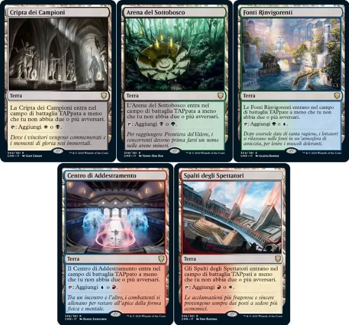 - Iniziamo con le rare, voglio dare spazio alle ultime Crowd Lands. Iniziato con Battlebond, questo ciclo di terre è ideato appositamente per le partite in multiplayer. Tutti i giocatori di Commander devono averle. Vediamo: Cripta dei Campioni, Arena del Sottobosco, Fonti Rinvigorenti, Centro di Addestramento e Spalti degli Spettatori;