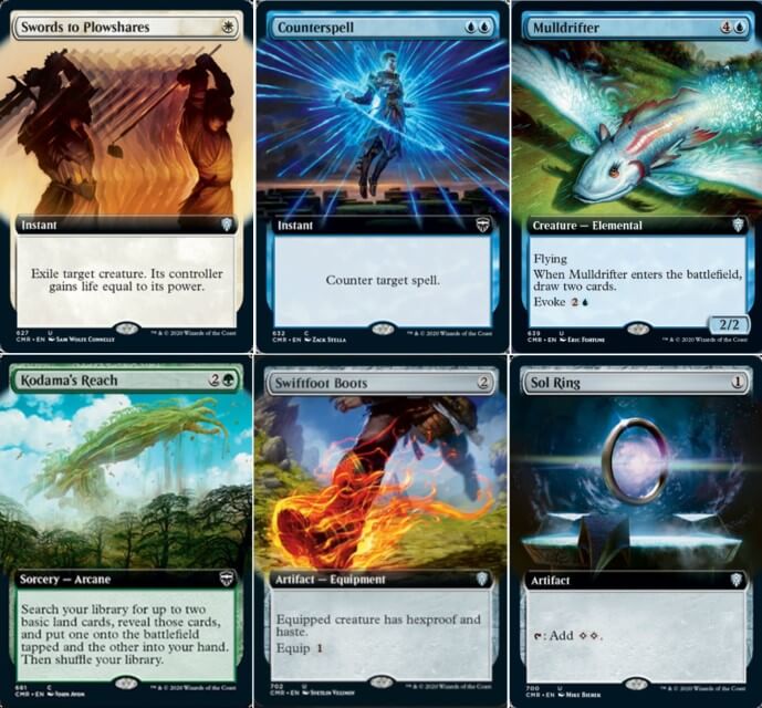 - Partendo con le non comuni, tra le ristampe rivediamo: Custode dell’Isola Evos, Perfetta Autoritaria, Sirenide Domatempeste, Saggia della Rivendicazione, Myr Scintillante (declassato a non comune), Streghe Cuombajj (finalmente i giocatori di Pauper potranno recuperarla con facilità), Ritornare Polvere, Virtù Intoccabile, Aprire l’Armeria, Massacrare i Forti (declassata a non comune), Sete di Conoscenza, Volontà Suprema, Vessare, Prostrare, Tre Visite, Tritacodici, Ricettacolo di Pensieri e Sigillo Arcano. Tra le migliori novità, vi segnalo: Lama Notturna di Nadier (una creatura da tortura per gli archetipi Token, tornerà utile in Commander), Predoni della Costa (in multiplayer infligge danni consistenti), Spadinaio della Flotta Abissale (infligge abbastanza danni, visto che in Commander si giocano molti artefatti), Cavaliere Bestiale Frenetico (una creatura inedita, ideata appositamente per il multiplayer, che permette agli avversari di sconfiggersi a vicenda. Interessante), Sapienza Demoniaca (buon peschino, ma bisogna stare attenti al malus. Da giocare nei deck rapidi o che donano le carte agli avversari), Banchetto della Successione (mass removal che ti rende il monarca), Torrente Vulcanico (mass removal per Storm con Cascata), Esplosione di Ricchezze (un peschino con danni randomici, le sei mana sono davvero pesanti), Mazza della Meteora (ottimo equipaggiamento per il Commander, la Cascata torna sempre utile), Ritrovo dei Senza Gilda (Bounce Land incolore, troverà molto spazio in Commander e negli Incolor di Legacy), Macchina dell’Ingegno (nonostante il costo di mana pesante, l’abilità e la Cascata sono molto utili negli Artifact Combo di Commander), il “Ciclo dei Famigli” (cinque creature leggendarie che potenziano costantemente il comandante), Prava della Legione d’Acciaio (da giocare per proteggere le pedine), Alharu, Ritualista Solenne (da giocare negli archetipi Tokens e Counter di Commander), Ardenn, Archeologo Intrepido (molto utile negli ibridi Auras ed Equipment), Rebbec, Architetta dell’Ascensione (una buona creatura leggendaria per proteggere i propri artefatti, da giocare negli Esper), Fantasma di Ramirez di Pietro (interessante per riciclare le carte scartate), Malcolm, Navigatore dagli Occhi Acuti (perfetto per negli archetipi Pirate per generare tesori), Siani, Occhio della Tempesta (per profetizzare negli archetipi Fly di Commander), Glacian, Ingegnere della Pietra del Potere (buono negli Artifact di Commander per acquisire carte), Keskit, lo Scultore di Carne (per pescare nei deck Sacrifice di Commander), Miara, Spina della Radura (buon peschino negli Elf Tribal), Nadier, Agente di Vesprenel (per pescare negli Elf Tribal di Commander, è abbastanza pesante), Armix, Devastatore di Filigrana (è interessante come removal nei deck Artifact, specialmente in Commander), Tormod, il Profanatore (buon spedinatore contro i removal da cimitero. Peccato che non ha un effetto esponenziale), Braghe, Saccheggiatore di Bronzo (davvero valido per pescare negli archetipi Pirate), Alena, Trappolatrice di Kessig (per aggiungere mana negli Aggro e Critters), Toggo, Armaiolo Goblin (un generatore di equipaggiamenti, torna utile nell’archetipo Equipment di Commander), Haalna, Ranger di Kessig (buon removal continuo per i deck Big di Commander), Numa, Capitano Joraga (per potenziare gli Elf Tribal), Slurrk, Onnidivoratore (un distributore di segnalini), Gilandra, Evocatore di Boscocavo (da giocare solo con le magie Big, torna utile per pescare nell’archetipo), Kangee, Custode Celeste (pseudo-lord per gli archetipi Fly), Arumi della Marea Morente (decisamente utile per rigiocare creaturoni, tornerà utile in più formati), Juri, Signore della Rivista (davvero una bomba per gli archetipi Sacrifice, peccato non poterla giocare in Standard!), Tuya Artiglio d’Orso (in draft diventa molto grande se accompagnata da creaturoni), Hamza, Guardiao di Arashin (ottimo negli archetipi 1+/+1 per giocare magie pesanti, perfetta in Commander), Thalisse, Sensitiva Riverente (perfetta negli archetipi Token di Commander per spedinare in massa), Abominio di Llanowar (un bestione per gli archetipi Elf, specialmente in draft), Capitan Vargus Veemente (da giocare negli archetipi Pirate di Commander), Imoti, Celebrante dell’Abbondanza (perfetta negli archetipi Big, permette combo concatenate) e Reyav, Mastro Fabbro (da giocare negli Equipment e negli Auras);
