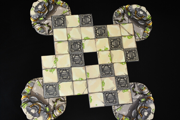 Create l’area di gioco orientando e posizionando le 4 plance tempio a vostro piacimento. Ogni plancia dovrà essere connessa ad un altra per almeno 2 quadrati per lato. Cosi potrete creare un quadrato 6×6 o sfasandole otterrete un campo di gioco come quello che vedete qui in foto.