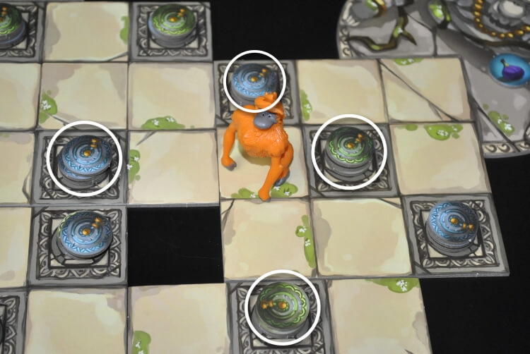 Dopo essersi mossi, l’orango potrà girare il primo gettone Giara di una pila che si trova nella sua stessa riga o colonna. Nelle caselle tra la sua miniatura e il gettone che vuole svelare non ci devono essere altri gettoni Giara, l’altro Orango od ostacoli (buchi creati con l’accostamento delle plance Tempio).