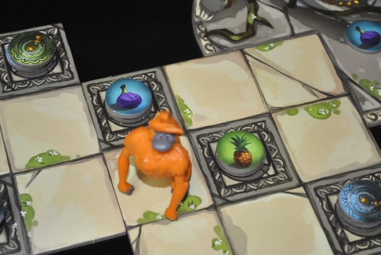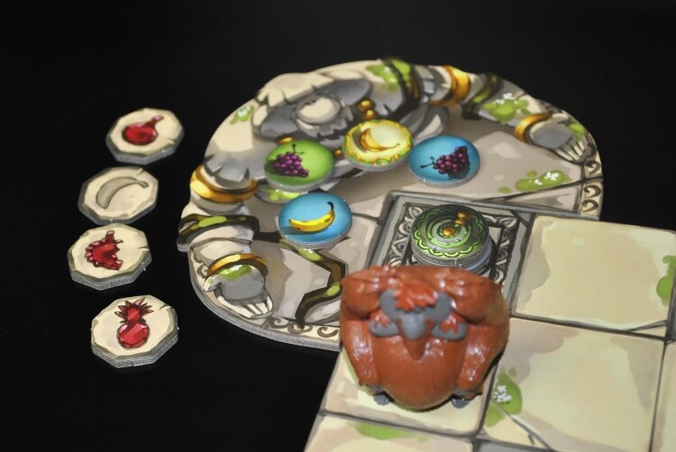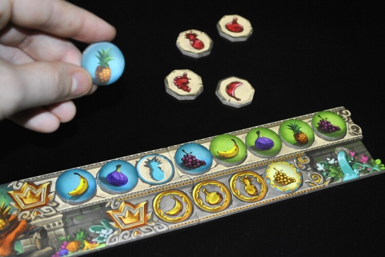 Se rivelate un frutto diverso, ottimo! Scegliete se continuare o fermarvi ma se avete svelato un frutto già rivelato (non importa se abbia uno sfondo colorato in modo diverso) ahimè perdete tutto! Posizionate i gettoni rivelati sulle plance Statua che si trovano all’angolo delle relative plance Tempio: per questo turno non porterete a casa nessun frutto.