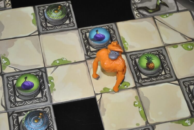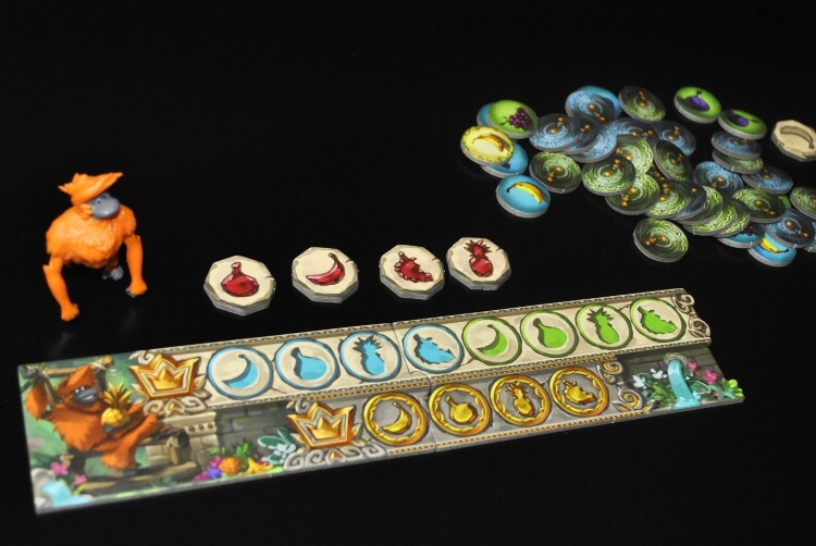 Ogni giocatore sceglie uno dei due oranghi, lo prende e prenderà anche la relativa plancia giocatore e un set di 4 gettoni rubino (tutti i gettoni devono avere un frutto diverso).