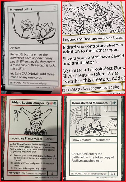Le carte di prova sono raffigurate con le schede playset della Wizards. Le illustrazioni sono abbozzate, mentre gli effetti delle carte ricordano quelli delle carte Unset. Queste carte non possono essere giocate nei formati costruiti, sono giocabili solo in questa tipologia di draft. La Wizards ha lasciato intendere che alcune idee delle carte di prova potrebbero essere riproposte in futuro, ovviamente verranno ricorrette per non sbilanciare il gioco competitivo. Anche in questo caso, ho molta difficoltà ad elencarvi queste carte particolari: vi consiglio di cliccare qui per visualizzare l’elenco completo.