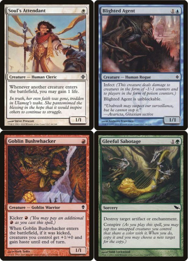 - Per le comuni vediamo: Tramutante Nerboruto (un lord obbligatori per i vari Sliver Tribal), Custode dell’Anima (altra carta obbligatoria per i Life e Soul Sisters di Modern), Agente Maligno (essenziale nei vari archetipi Infect di tutti i formati), Decomposizione Riecheggiante (un buon mass removal per pedine da giocare in Pauper), Monile Funebre (sempre utile e versatile, anche in monocopia, da usare nei vari Control che sfruttano il nero), Veggente di Visceri (attivare di combo di molti archetipi del Modern, attualmente lo si gioca nel teir 1 Heliod Life), Indagine Scottante (un classico negli archetipi che giocano di scarto e di cimitero, è obbligatoria nel deck Hollow One), Goblin in Agguato (utile nei Goblin Tribal e nei Red Deck Wins per assalire l’avversario nell’attacco finale), Rituale Febbrile (acceleratore di mana innevato obbligatorio negli Storm di Modern), Druido di Borealia (elfo fonte di mana che trova spazio nelle varianti di Elf Tribal, inoltre è molto giocato in Commander), Sabotaggio Divertente (un altro cult delle side da Pauper, ovviamente, sfruttato contro incantesimi ed artefatti) e Sfarfallante (fa combo di mana infinito con Grande Architetto, presente in questa edizione);