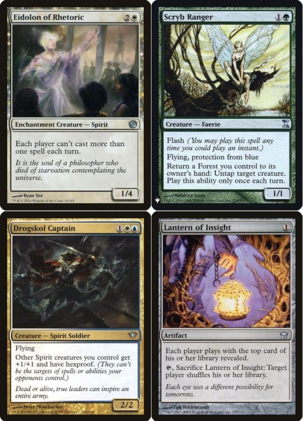 - Per le non comuni vediamo: Apparizione della Retorica (creatura ritardante giocata in molti deck di Modern, dallo Spirit Aggro fino al citato Heliod Life), Araldo Ignifero (buon tutore per elementali, attualmente viene giocato nell’Elementals di Legacy), Ranger di Scryb (sempre utile per generare piccole combo, attualmente lo si gioca nel Maverick di Legacy), Pungiglione Nutrice (ha sempre trovato spazio nei vari Midrange di Modern, oggi lo si vede negli Heliod Life e nei Devoted Company), Capitano dei Drogskol (lord da giocare assolutamente nei vari Spirit Tribal), Tramutante Armonico (carta obbligatoria nelle side degli Sliver Tribal), Funerale Mentale (nei Dimir Mill è obbligatoria, ma la si gioca anche nelle sideboard dell’Oath of Druids di Vintage), Tritacodici (carta essenziale per l’archetipo Lanter Control e nei Commander con Emry, Nascosta nel Loch), Postazione Esplosiva (carta molto versatile da combo per infliggere danni continui, la si vede nel Teshar Combo di Commander, nell’Ivy Combo da Peasant, nei vari Dredge e Zombie Tribal di Modern), Logorare//Lacerare (altra carta giocata nelle side di molti formati), Lanterna della Perspicacia (essenziale per giocare l’archetipo Lantern Control di Modern), Stivali del Pioniere (in Commander è un buon equipaggiamento evasivo) e Nucleo di Mirrodin (torna sempre utile in Commander);