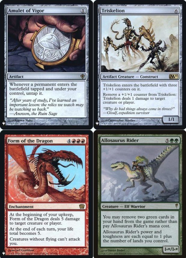 - Continuano con le rare. Vediamo: Kirin Celestiale (viene giocato in alcuni varianti dello Spirit Tribal di Modern, ma è da sfruttare con cautela), Isamaru, Segugio di Konda (nonostante sia superato, rimane sempre un pezzo di cuore per il White Weenie), Proclama della Rinascita (carta essenziale nel Martyr Life e Soul Sister per rigiocare combo e creaturine), Coda-Runa, Antenato Kitsune//Essenza di Coda-Runa (altra carta da giocare in Commander per proteggersi dagli avversari), Grande Architetto (come anticipato prima, va in combo con lo Sfarfallante per avere mana infinito), Allarme Anti-intruso (torna sempre utile per le combo di STAP, oggi lo si vede in Commander), Malia di Zur (altra carta molto giocata in Commander, ma trova spazio nello Zur’s Weirding di Modern), Portatore dell’Alba Nera (buon tutore per i penta-colore di Commander), Forma del Drago (incantesimo molto giocato nei Enduring Ideal e Nic Fit di Legacy, ma anche nello Show & Tell di Vintage), Fustigatore con Stigma (carta anti-Life, attualmente si gioca molto in Commander), Cavalca Allosauro (recentemente è stato rivaluto, lo si gioca nell’Allosaurus Combo e nella variante Neobrand di Modern), Desiderio Scintillante (un desiderio torna sempre utile per attivare le combo), Vassallo della Pira (molto giocato nei Boros da Commander), Amuleto del Vigore (essenziale per giocare il tier Amulet Titan, forse è la carta più interessante dell’offerta), Pozza della Conoscenza (molto giocata in Commander, la si vede anche nelle side di UW Stoneblade), Meridiana dell’Infinito (altra carta da combo che trova spazio in determinate situazioni), Domina Mente (un cult dell’UrzaTron e delle sue varianti, è utilissimo anche in Commander), Scatola degli Enigmi di Teferi (altra carta molto giocata in Commander per l’acquisizione delle carte), Re Mietitore (da giocare solo in Commander come Comandante), Triskelion (altro cult da combo di danni di massa, è molto giocato nel MUD di Vintage), Globo Scacciastreghe (altra carta molto potente per proteggersi, si gioca nel Golos MUD di Vintage e nell’Eldra Tron di Modern), Rifugio dell’Alchimista (terra molto giocata in Commander, generando situazioni a sorpresa), Minamo, Scuola sul Bordo dell’Acqua (oltre in Commander, viene anche giocato nel Merfolk Tribal) e Shizo, Deposito di Morte (sempre utile in Commander);