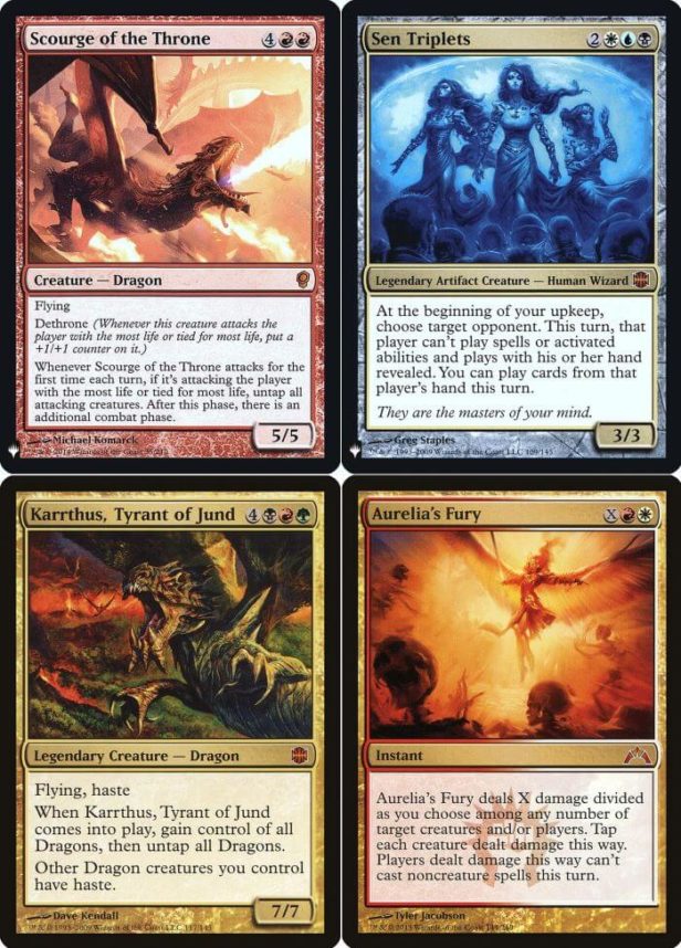 - Infine, vediamo tutte le rare mitiche: Specchio del Lich (nonostante sia un ritardante per la morte, non è mai stata giocata in competitivo. In questo formato caotico potrebbe tornare utile), Scourge of the Throne (per avere un turno extra, lo si vede poco in Commander. Anche questa carta è adatto per il caos dei Mystery Booster), Trio di Sen (altro cult da Commander Duel, che blocca le giocate dell’avversario), Sarkhan il Folle (un tempo si giocava nei Jund, oggi lo si vede in qualche Commander con molti draghi), Rete del Maelstrom (altra carta da giocare esclusivamente nei Pentacolor di Commander), Karrthus, Tiranno di Jund (altro cult per il Dragon Tribal di Commander) e Furia di Aurelia (fino a qualche anno fa era giocata nelle sideboard del Jeskai Ascendancy, oggi lo si vede in Commander).