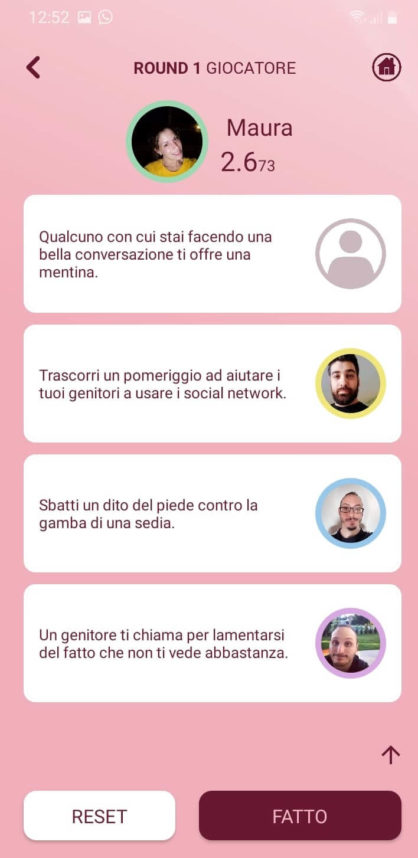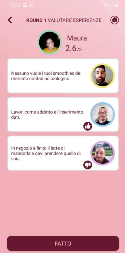 A ciascun giocatore saranno proposte delle situazioni che dovrà abbinare segretamente agli altri giocatori, sperando che poi la sua esperienza (la sua situazione) sarà votata la migliore tra tutte quelle che saranno state abbinate a lui.
