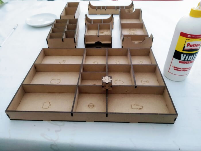 Terminato il montaggio, ci troveremo in mano un inserto delle dimensioni dell’intera scatola (che conterrà tutti i meeple e i token del gioco) ed una serie di inserti componibili destinati alle tessere del gioco (stanze, miniere, pascoli,…).
