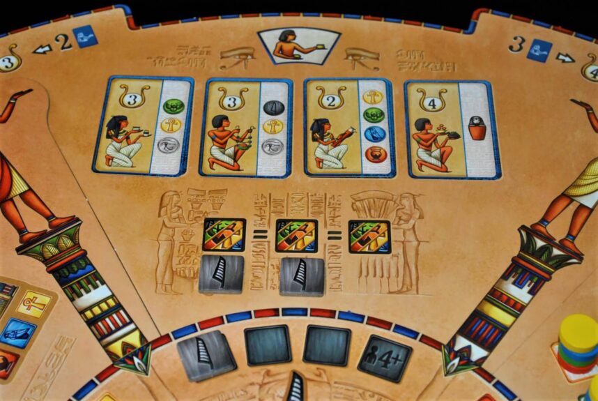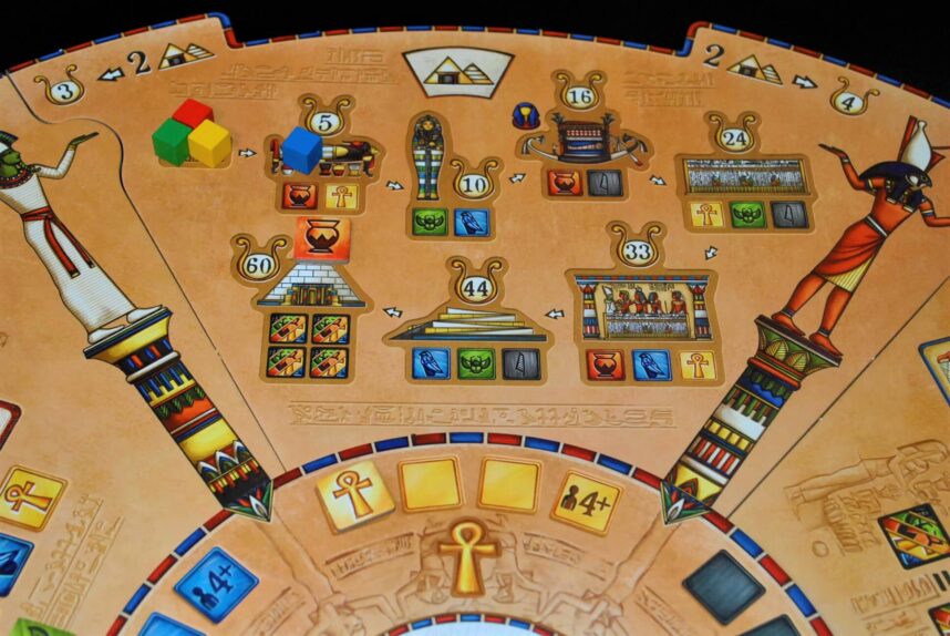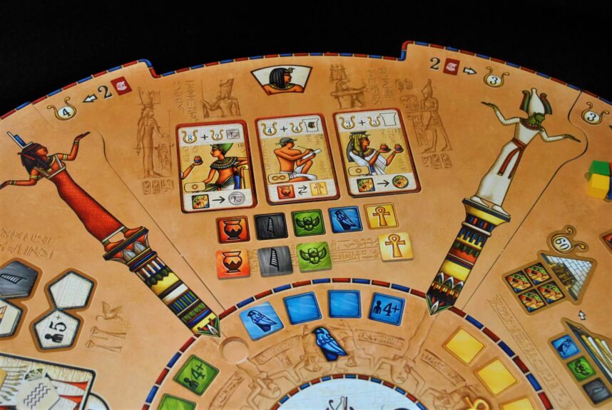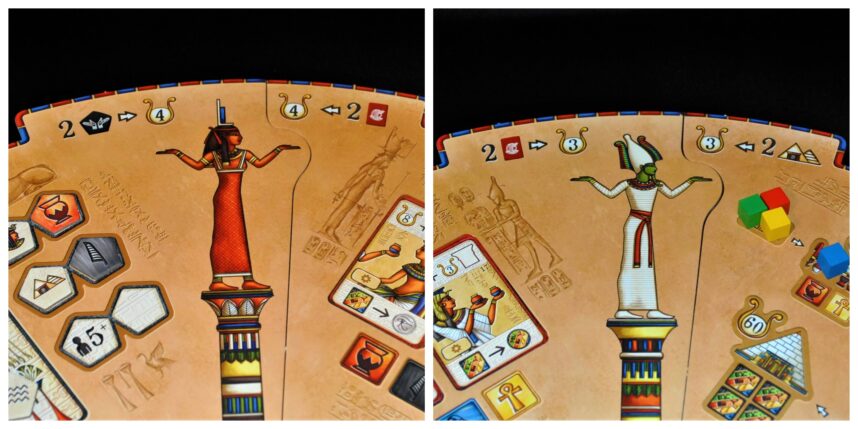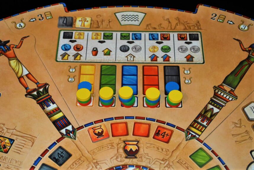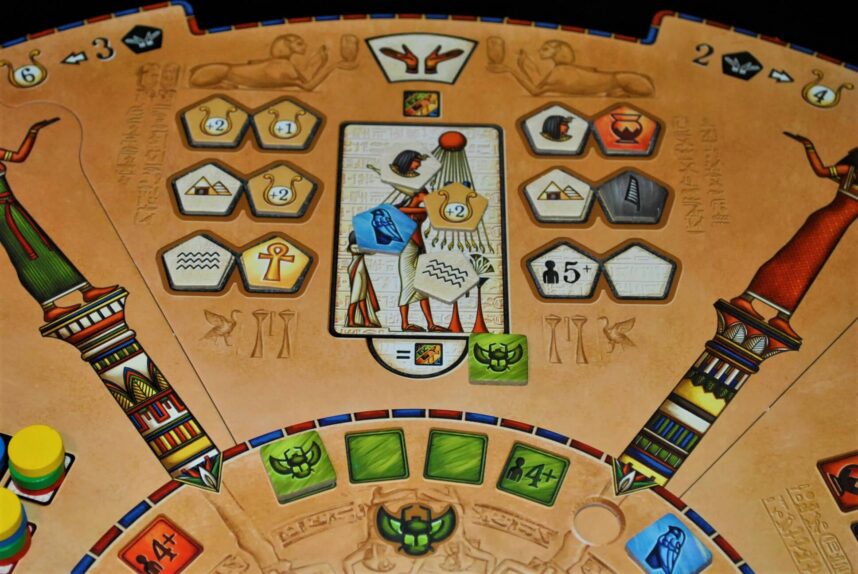 Ad esempio, nella foto, il giocatore paga una risorsa rossa per accedere all’area Nilo e poi paga una risorsa nera e gialla per poter fare la prima azione della tabella. Infatti riceve una risorsa blu e rossa e può scegliere di avanzare 2 volte sul tracciato giallo e/o nero.