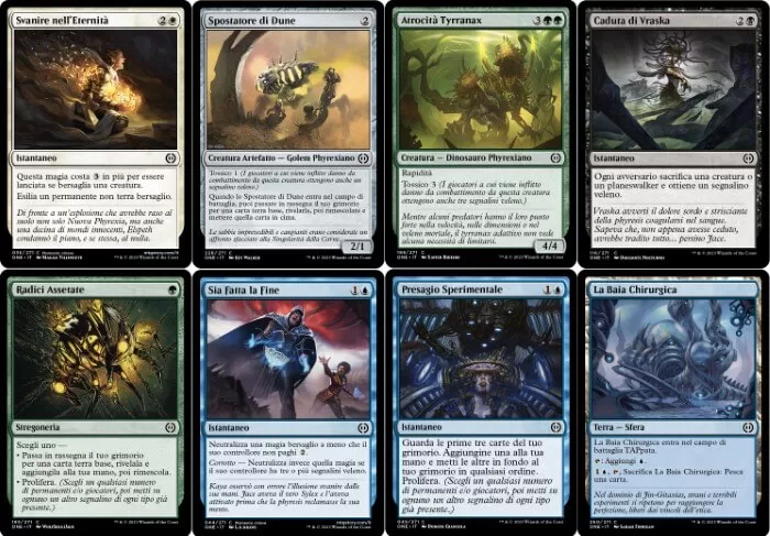 - Tra le restanti carte comuni, vediamo: Distesa Terramorfica, Prisma Profetico, Costrizione, Brivido della Possibilità, Scarica Voltaica (ristampe classiche e sempre utile su più fronti), Carica degli Acari (buon removal o spedinatore per gli archetipi Token), Perturbazione Planare, Consacrare con l’Afflizione, Sguardo Annientatore, Predazione Spietata, Caduta di Vraska, Dose Ipnotizzante, Fendente di Esaoro, Sussurro di Dross, Fronde Carnivore, Svanire nell’Eternità (i removal comuni dell’espansione), Atlante di Phyrexia (buon motore di mana per il Commander), Radici Assetate (buon ramp e proliferatore che tornerà utile nei Control di Standard), Indagine Infettiva, Prologo della Phyresis (buoni peschini per gli archetipi Infect di Pauper), Crescendo Fiammeggiante (utile negli Aggro e nei Red Deck Wins da Pauper per infliggere danni consistenti e pescare), Presagio Sperimentale, Intuizione del Vivichirurgo (peschini per il prossimo Standard) e Sia Fatta la Fine (buon counter per gli archetipi Infect, potrebbe tornare utile anche fuori lo Standard).