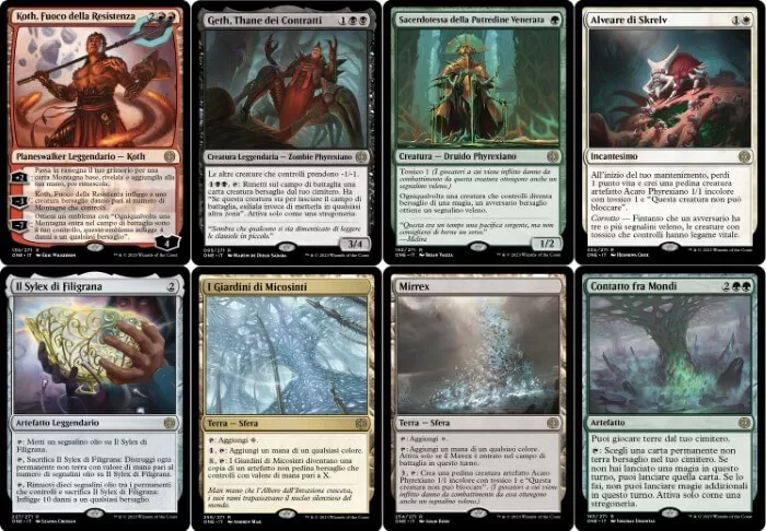 - Per concludere con le rare, vediamo: Arena di Phyrexia (ristampa sempre utile in Commander per pescare), La Germessenza (la terra perfetta per gli archetipi Toxic e Phyrexian Tribal), Lama delle Anime Condivise (potrebbe tornare utile in Commander per copiare creature molto potenti), Forgia di Urabrask (per generare pedine rapide negli archetipi Oil), Aliante Aladrago (da giocare in draft come creatura evasiva), La Facciata Monumentale (terra utile negli archetipi Oil), Sorgente di Norn (per pescare negli archetipi Oil), Monumento alla Perfezione (interessante per reperire terre e genere una finale, tornerà molto utile in Commander), Tavoletta del Completamento (generatore di mana e peschino per gli archetipi Oil), Apparato Legamente (da giocare negli archetipi Oil Control per lanciare con facilità le magie indicate) e Rifugio dei Mirran (un motore di mana che permette di sfruttare le abilità di tutte le terre al cimitero, potrebbe tornare molto utile in un Loam o in Lands).