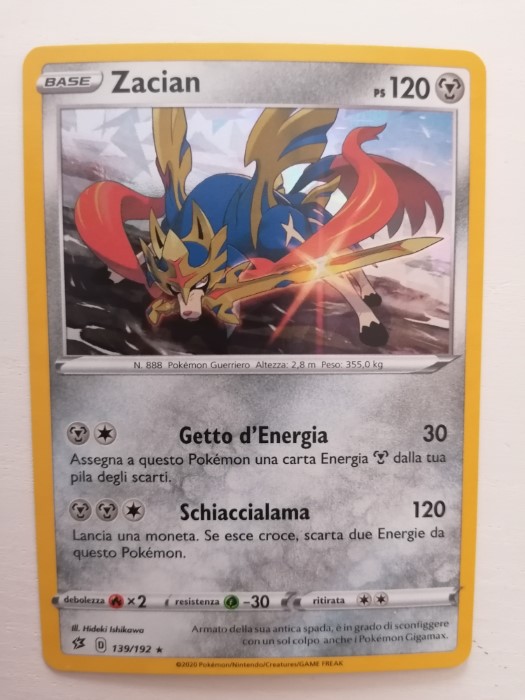 Questo Pokemon può utilizzare due mosse Getto d’Energia e Schiaccialama con questa seconda che è può infliggere fino a 120 Danni, grazie all’utilizzo di Getto d’Enegia Zacian può riciclare più volte le carte energia che sprecherà con la sua prima mossa.