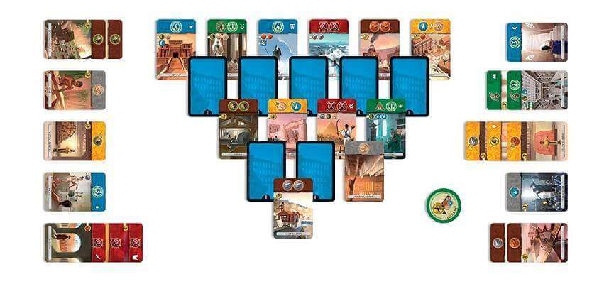 Le carte vengono disposte in maniera tale che ogni giocatore potrà, durante il suo turno, prendere solo una carta tra quelle rivelate della riga più in basso dello schema di carte. Le carte sono disposte in maniera tale che alcune risulteranno “bloccare” la rivelazione delle carte della riga superiore e quindi impedirne la loro pesca. Nel momento in cui una carta non risulterà più bloccata dalle carte delle righe sottostanti, in quanto quest’ultime saranno già state pescate nei turni precedenti, essa verrà girata a faccia in su (nel caso in cui fosse a faccia in giù) e potrà essere presa in considerazione tra le scelte di pesca dal giocatore di turno.
