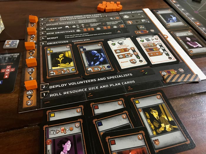 Ogni giocatore riceve all’inizio della partita le proprie 12 carte, 5 token trasporto, una risorsa jolly, un obiettivo di “emergenza” e 4 monete. Ogni giocatore posizionerà un proprio cubetto su un caposaldo di un distretto, per determinare la base di partenza per le proprie esplorazioni. Successivamente 3 carte sono posizionate in due degli spazi azione, mentre altre due andranno in ospedale, pronte per essere recuperate tramite una apposita azione.