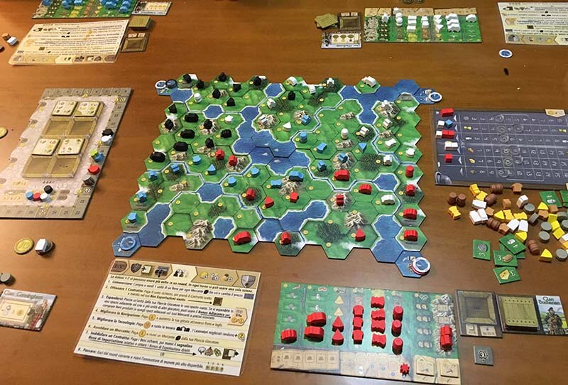 Altre azioni di corollario sono il miglioramento delle tecnologie a disposizione (mercanti, navigazione, estrazione minerarie e taglio legna). Guardiamo in dettaglio le 7 azioni disponibili durante i singoli round: