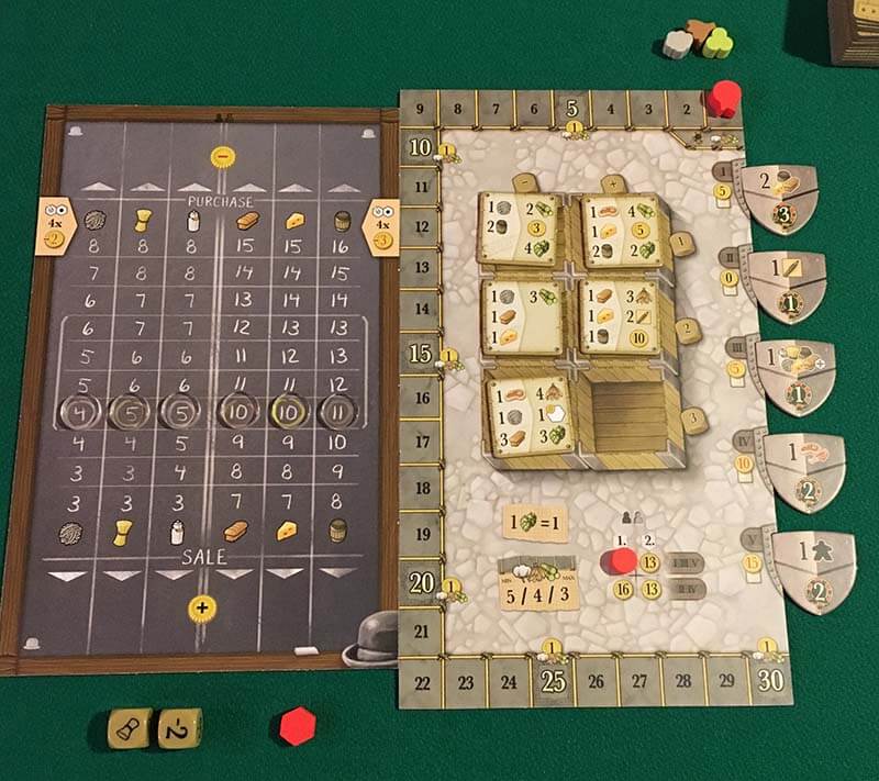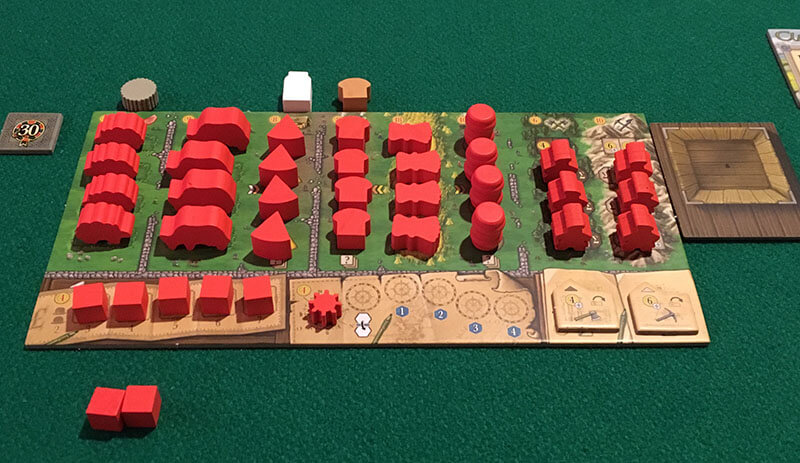 setup plancia giocatore (da sx a dx: Pecore, mucche, caseifici, forni, campi, distillerie, boscaioli, minatori, mercanti, navigazione, miglioramenti tecnologici)
