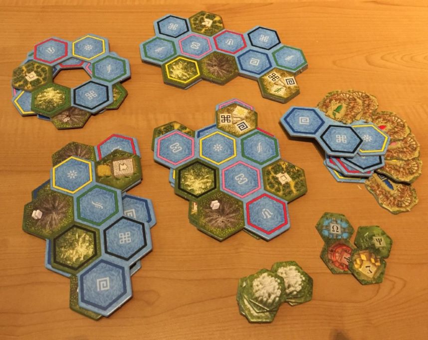 12 tessere isola verranno poi posizionate sopra la mappa composta dalle altre tessere per rendere ancora più casuale la conformazione della plancia di gioco.