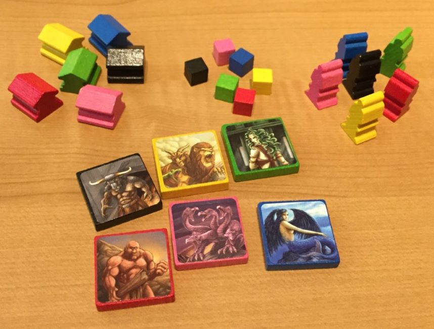 24 segnalini divinità in legno sono utilizzati per tener traccia del favore delle varie divinità “minori”, mentre 4 navi-meeple serviranno per indicare la nostra posizione sulla mappa di gioco.