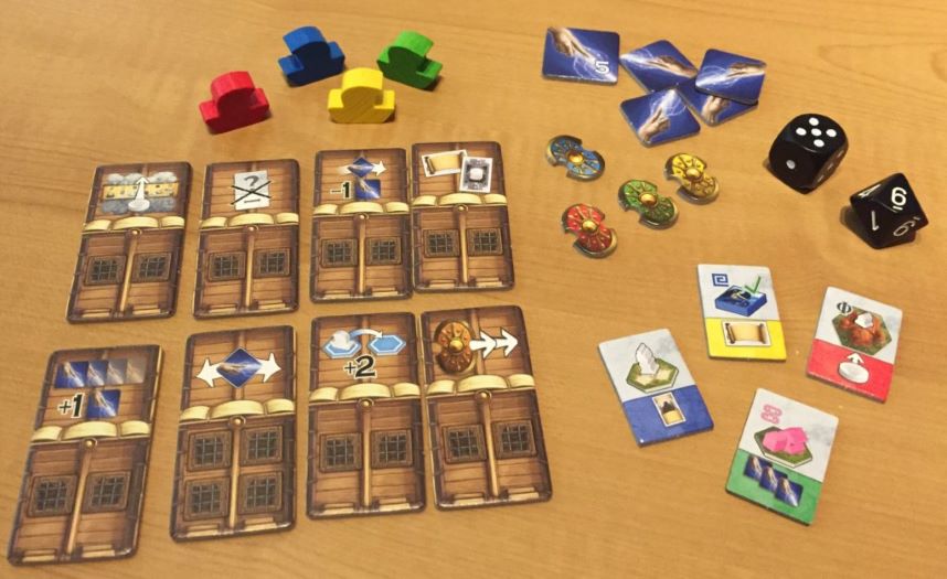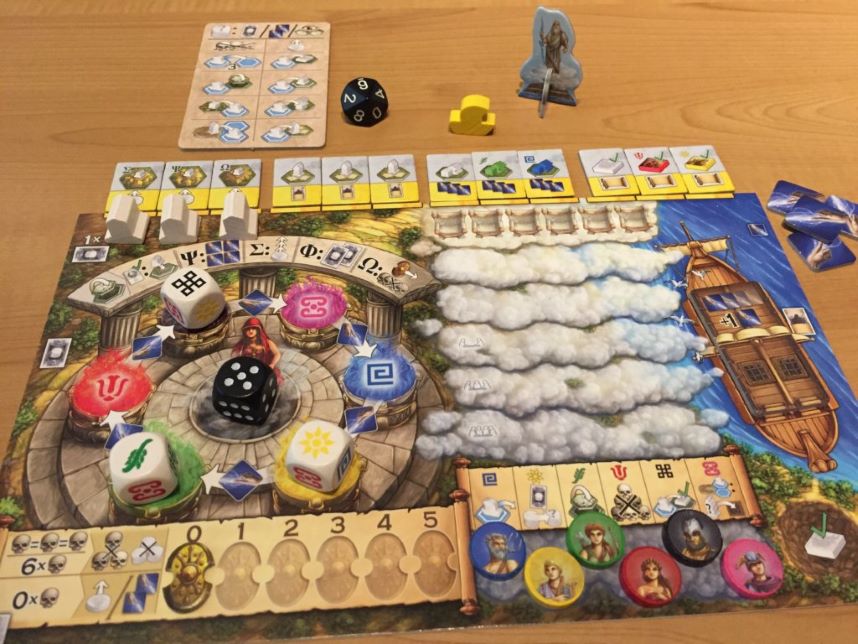 Infine, ognuno prende 3 dadi oracolo, li lancia e li posiziona sui relativi spazi della propria plancia. Queste rappresentano le possibili azioni di ogni giocatore per quel turno.