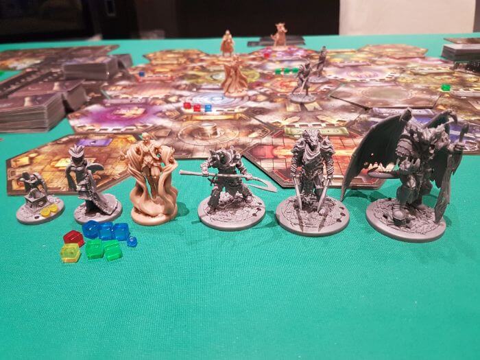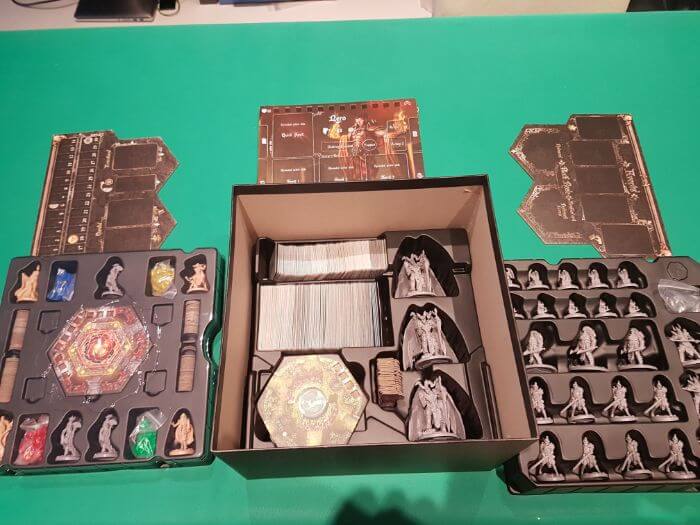Le carte sono ben finite e centrate, con schede riassuntive molto pratiche mentre le miniature sono di grandi dimensioni e davvero ben dettagliate e scolpite (soprattutto la posa di “Nero” che fluttua tra le fiamme ma anche le creature evocate non sono da meno) secondo gli standard dei giochi più recenti (meglio per ciò che riguarda il lavoro di scultura) e soprattutto quasi mai invasive.