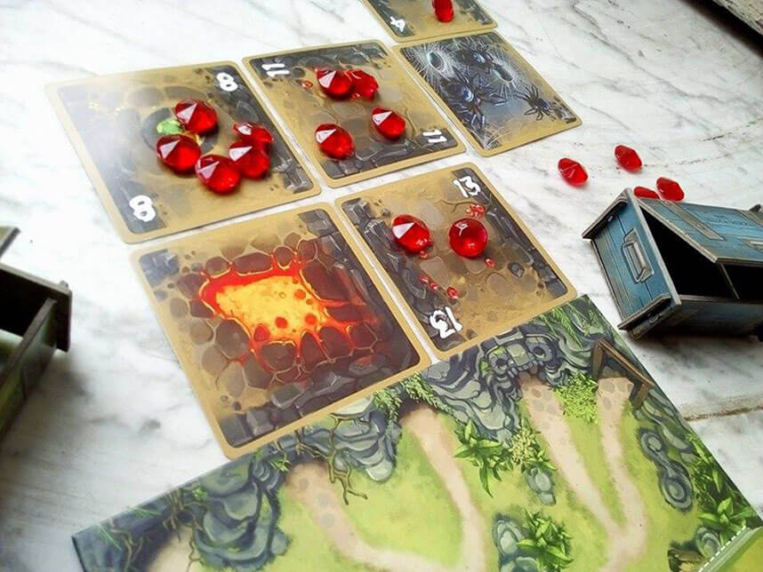 Ogni giocatore riceve le carte voto, il meeple del proprio colore, il relativo bagaglio e tutto l’entusiasmo per partire durante la prima missione dopo aver semplicemente mescolato il mazzo di carte quadrate. Lo scopo del gioco è quello di riuscire ad avere a fine partita il maggior numero di gemme e ciò sarà possibile solo valutando bene ogni mossa da fare dopo ogni passo fatto nell’esplorazione delle caverne. Un giocatore scelto come mazziere, che può tranquillamente cambiare di volta in volta, ha il compito di girare la prima carta del mazzo: la carta può rappresentare un certo numero di gemme ritrovate o un pericolo. Se il numero di gemme è divisibile per il numero di giocatori, si assegnano ad ognuno lasciando eventuali eccessi sulla carta, altrimenti tutto il bottino rimarrà lungo il percorso, se invece si troverà un pericolo, gli esploratori dovranno stare in allerta visto che alla seconda carta con lo stesso disegno (che può essere un serpente velenoso, un masso rotolante o una stanza con gli spuntoni) il round di gioco termina e tutto il bottino non messo in salvo verrà perduto. Che sia un ritrovamento prezioso o un pericolo scoperto, ad ogni carta girata, tutti i giocatori scelgono una carta voto per decidere il proprio destino: continuare il cammino all’interno dell’antro irto di insidie o tornare al campo base? Nel primo caso, i giocatori rimasti gireranno una successiva carta rischiando ovviamente la pelle ma avendo anche accesso ad ulteriori gemme, mentre chi decide di tornare all’ovile, potrà inserire all’interno del proprio bagaglio tutti i tesori raccolti in quel round e si potrà anche spartire con i colleghi fifoni tutti quelli visibili nelle sezioni di caverna già esplorate! Un round termina quando tutti gli avventurieri decidono, man mano, di tornare all’accampamento, o quando due pericoli dello stesso tipo si manifestano lungo il percorso: con 5 round termina la partita che ufficializzerà come vincitore il possessore del numero più alto di pietre preziose.