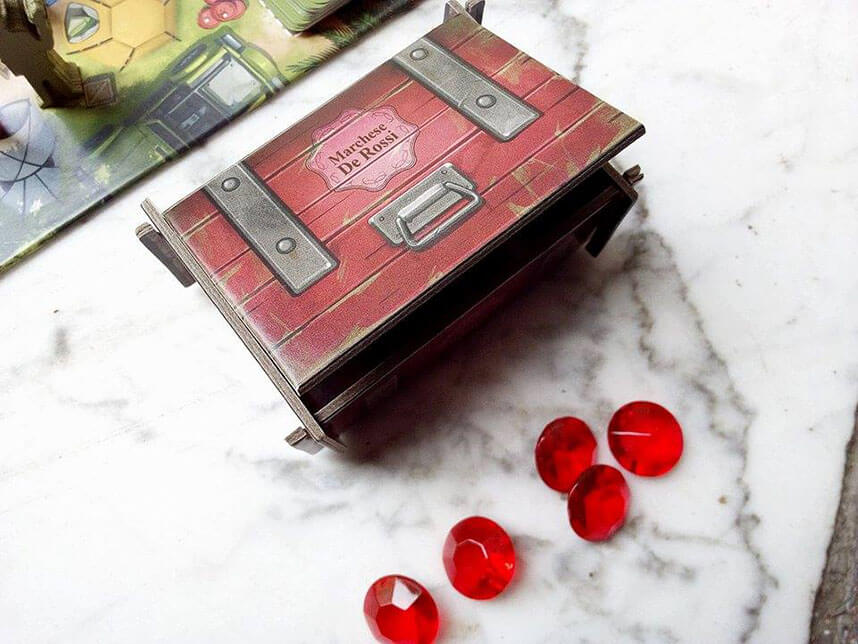 La bella confezione quadrata di “Diamant” è una gioia per gli occhi e appena presa tra le mani porta subito il giocatore nella sua atmosfera selvaggia, come se fossimo nel famoso “Jumanji”. Al suo interno troviamo una plancetta con il campo base e l’ingresso alle 5 caverne che vanno esplorate durante una partita, 8 meeples dalla simpatica forma da avventuriero in vari colori (a dire il vero non tutti entusiasmanti), una coppia di carte voto per ogni giocatore, una serie di bellissime gemme trasparenti che ricordano dei preziosissimi diamanti e una serie di gemme rosse molto brillanti, 5 tasselli che faranno da segnaturni durante la partita, un mazzetto di carte dalla forma quadrata che rappresenteranno le varie parti delle caverne da esplorare e soprattutto 8 bagagli in cartone che custodiranno gelosamente le pietre preziose portate in salvo dopo una spedizione.