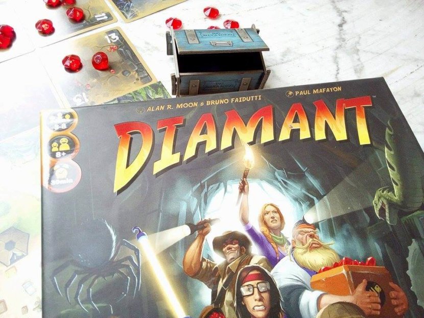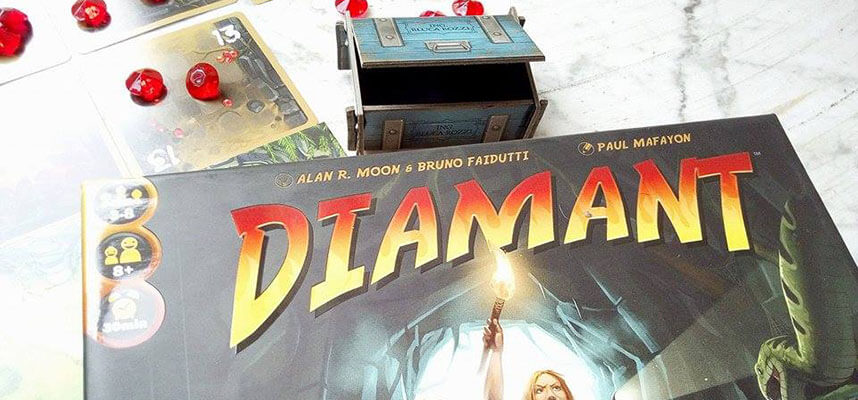 “Diamant” è uno dei classici esponenti della meccanica “push your luck” visto che i giocatori dovranno saper tentare la fortuna senza però azzardare troppo seguendo la propria ingordigia. Come componenti, “Diamant” si presenta benissimo, visto che è una delizia poter custodire tutto nei piccoli ma funzionali bagagli di cartone ed è molto scenografico vedere dipanarsi la caverna carta dopo carta anche con bellissimi disegni che rappresentano i pericoli da trovare. La possibilità di divertirsi fino ad 8 giocatori è sicuramente un punto a favore di questo gioiellino, visto che il numero di presenze intorno al tavolo non rallenta assolutamente il flusso di gioco, ma anzi, aumenta l’interazione , alimentando le supposizioni tra i vari giocatori sul loro ritiro o sull’avidità di mettere le mani su ulteriori bottini. La durata di una mezz’ora circa lo rende un filler divertente e piacevole da intavolare dopo una bella serata passata in compagnia di qualcosa di più corposo, ma funge anche da introduttivo perfetto per mettere i nuovi giocatori alla prova con un titolo semplice, coinvolgente e che spinge sempre a fare una nuova partita.