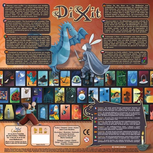E’ fondamentalmente un gioco di carte. Dimenticate, però, i numeri e i simboli canonici. Qui ci sono solo illustrazioni bellissime, realizzate da un’ispiratissima Marie Cardouat. La matematica serve solo a sommare i punteggi. Per Dixit c’è bisogno solo di immaginazione, intuito, senso dell’umorismo, un po’ di follia e tanta voglia di divertirsi.
