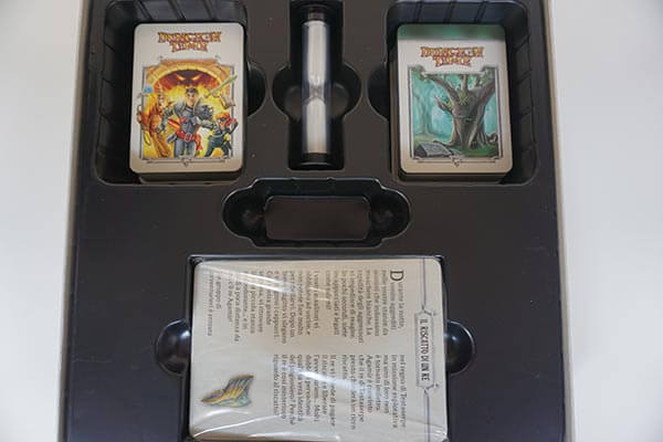 Dungeon Time contiene principalmente carte, ma anche tessere ricompensa di cartone e lo zaino. Le carte sono robuste e le tessere e le carte premio sono di cartone spesso. La scatola del gioco contiene un inserto dove tutto si adatta perfettamente senza sprecare spazio (sono queste le cose che adoro). Le illustrazioni veramente ben fatte.