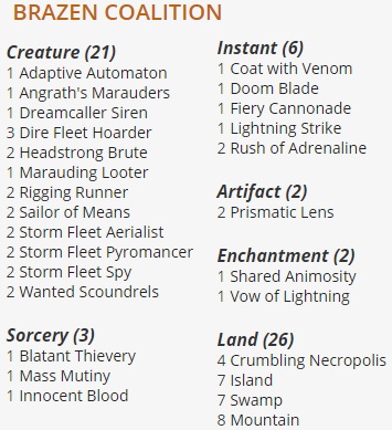 Brazen Coalition è tribal pirati dei colori Blu, Nero e Rosso. Lo scopo del deck è quello di aggrare per poi attivare l’abilità “Incursione“. Il resto delle carte sono removal e magie da controllo. Tra le carte utili possiamo notare: “Blatant Thievery“, “Mass Mutiny” e “Shared Animosity“.
