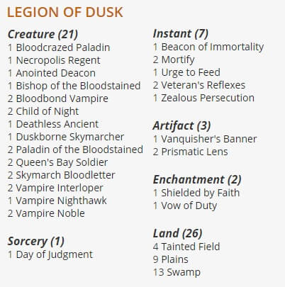 Legion Dusk è un deck vampiri molto basilare, dell’accoppiata di colori Bianco e Nero. Questo tribal è un midrange con creature evasive che fanno guadagnare molti punti vita. Il resto della magie sono dei removal e carte per potenziare i propri vampiri. Tra le carte utili possiamo notare: “Necropolis Regent“, “Vanquisher’s Banner” e “Day of Judgment“.