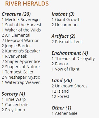 Il River Heralds è un tribal tritoni, dei colori Blu e Verde. Si tratta di un mazzo aggro, dove i tritoni si potenziano per arrivare all’attacco finale. Sono presenti molte magie di pump e di controllo. Tra le carte utili possiamo vedere: “Time Warp“, Rancor” e “Threads of Disloyalty“.