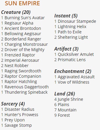 Sun Empire è un tribal dedicato ai dinosauri dei colori Bianco, Rosso e Verde. Si tratta di un rampa deck, dove giocheremo con facilità i costosi e devastanti dinosauri. Tra le carte utili possiamo vedere: “Regisaur Alpha“, “Quicksilver Amulet“, “Path to Exile” e “Lightning Helix”.
