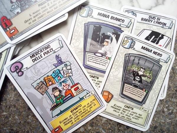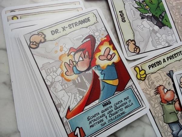 Sei carte offriranno i ruoli ad ogni giocatore: vengono chiamate carte nasone per una certa caratteristica facciale abbastanza pronunciata. Altre carte con un bel numero sul dorso indicheranno quelle da suddividere nelle 3 fasi in cui il gioco è composto: al loro interno sarà possibile trovare dei reperti che i giocatori vorranno ovviamente portare in salvo, delle minacciose guardie che vorranno invece tenere sotto stretto controllo tutto ciò che il mondo nerd brama riavere. L’ultima tipologia di carte presente all’interno della scatola è la “roba buona” e rappresenterà tutto ciò che sarà utilissimo per i giocatori per poter fronteggiare le guardie e riuscire a portare a termine l’obiettivo di recuperare i cimeli nerd: si tratterà infatti di trucchi che faciliteranno le azioni di gioco e nasoni non giocanti che potranno dotare i giocatori di potenti abilità.