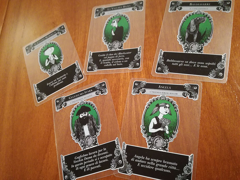 Il vero fascino di Gloom risiede nella componente di narrazione: ogni carta (personaggio, evento o morte che sia) ha, oltre al nome, un breve testo di storia che dà lo spunto per inventare e raccontare cosa effettivamente potrebbe essere successo.