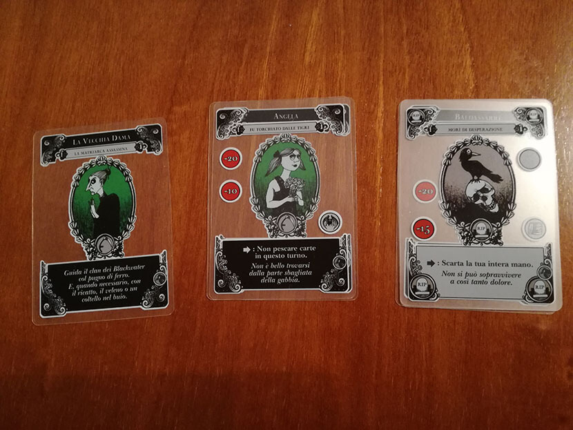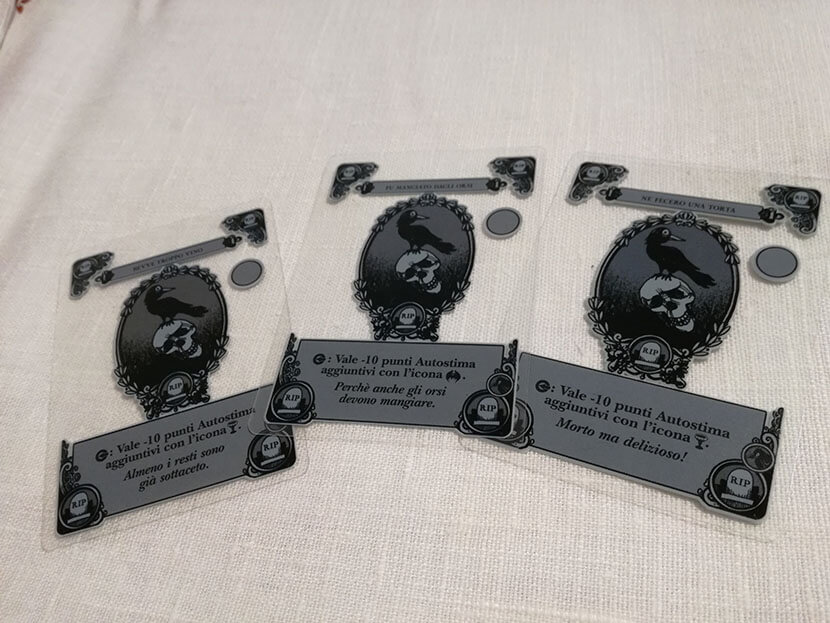 Botoli rognosi ed inferociti, cene di gala finite in tragedia, cadute da luoghi improbabili… queste carte sono il modo con cui abbassare il livello di Autostima dei nostri personaggi (o aumentare quello degli avversari).