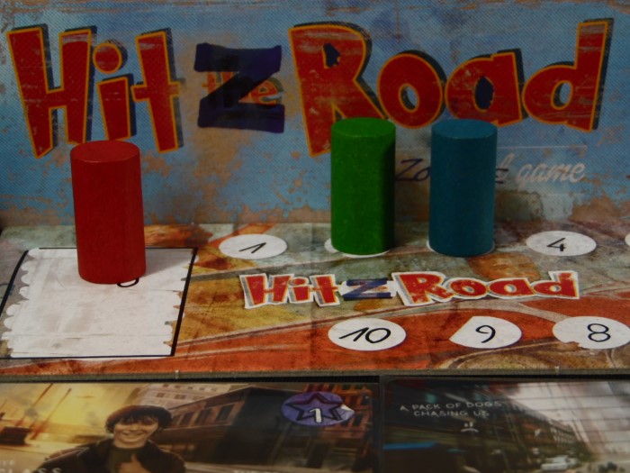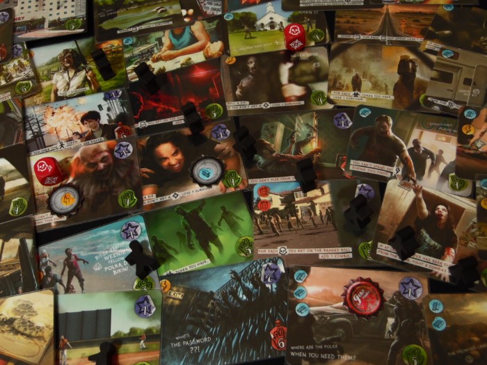 In basso troviamo l’evento che mettiamo in pratica e a seguire gli eventuali zombi che dovremo affrontare. Prendiamo il numero di meeple zombie indicato e ci prepariamo allo scontro che avviene con i dadi.