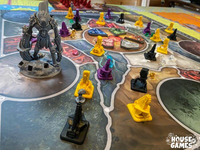 Quando la quinta carta regione viene girata si svolge l’ultimo turno e poi la fase fine di un anno, la carta colosso può non venir giocata se è l’ultima del mazzo. Ogni anno viene aggiunta una nuova carta colosso, perciò Il primo anno sarà di 5 o 6 round, il secondo di 6 o 7 e il terzo di 7 o 8. Ho trovato questa possibile varietà di durata, soprattutto nel terzo anno, davvero una meccanica intrigante, mette un po’ di aleatorietà e di push your luck nel meccanismo di gioco.