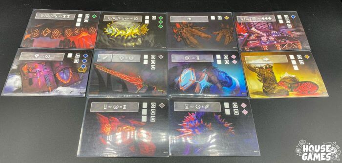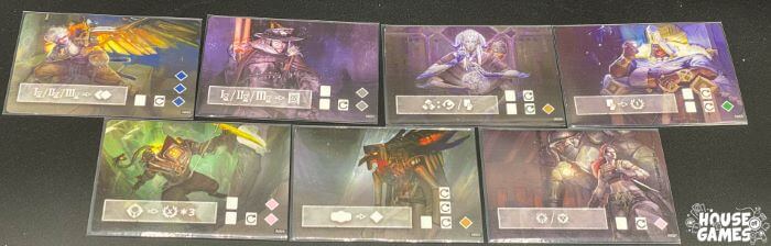 Ad inizio partita ci verrà assegnato o sceglieremo un cercatore ed un accessorio speciale. Ogni cercatore ha un’abilità, un numero di carte massimo da tenere in mano, un numero di carte massimo da poter attivare e una dotazione di Qoam di partenza diversi. La carta accessorio speciale assegna una seconda abilità unica al cercatore. Questa combinazione (e ce ne sono 120 possibili) da origine a un cercatore unico ad ogni partita e dovremo essere bravi a sfruttare le sue caratteristiche.